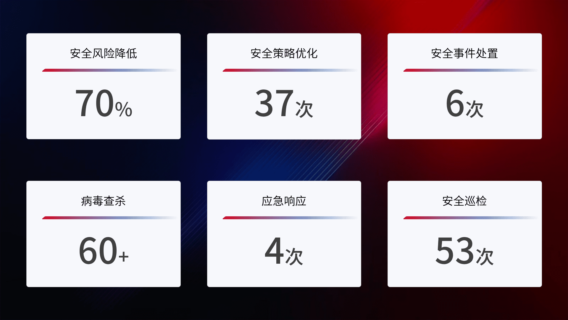提供全面的安全事件报告体系,,,包括处置报告、、、、周报、、季度和年度总结,,,,结合持续监控,,帮助客户深入了解网络安全状况。。。